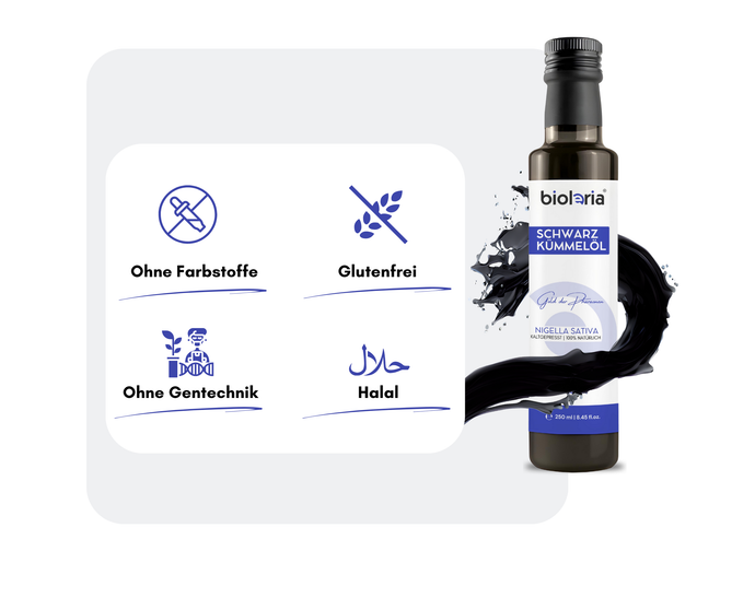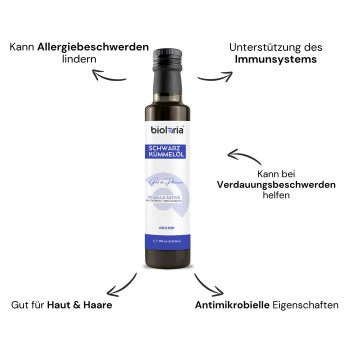 - Unterstützung des Immunsystems: Schwarzkümmelöl enthält Thymochinon, eine Verbindung, die für ihre immunstärkenden Eigenschaften bekannt ist. Es kann die Produktion von Immunzellen fördern und die Abwehrkräfte des Körpers stärken.