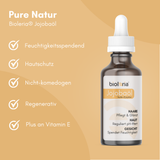 - Feuchtigkeitsspendend und Hautschutz: Jojobaöl reguliert den natürlichen Feuchtigkeitshaushalt der Haut und bildet einen schützenden Film, der die Haut vor Feuchtigkeitsverlust bewahrt und sie vor äußeren Einflüssen schützt.
