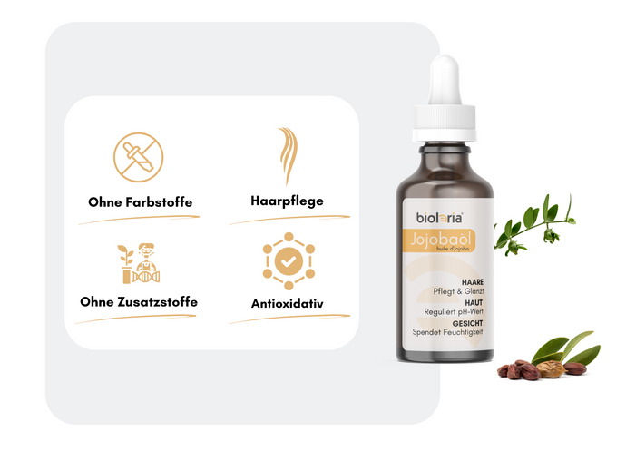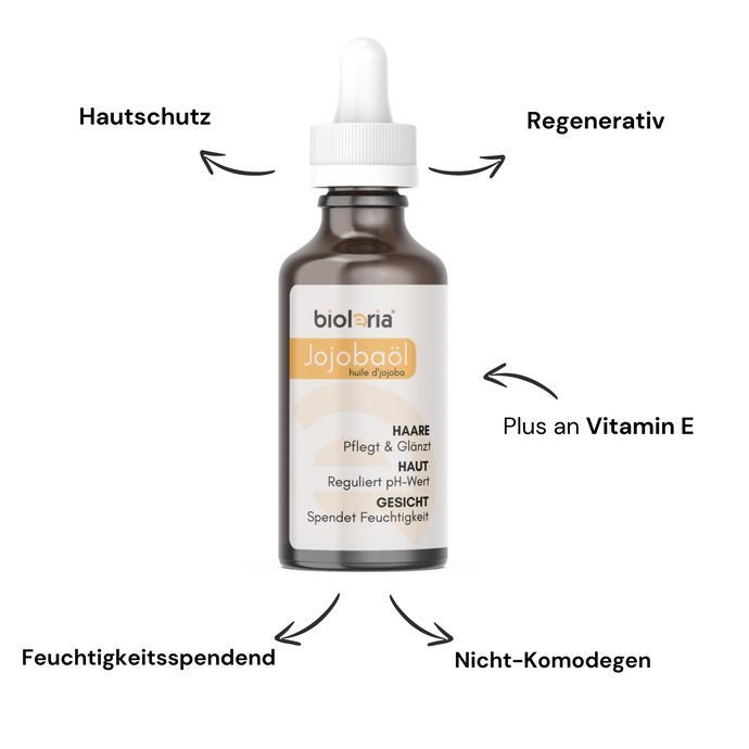 Jojobaöl ist reich an Vitamin E und Antioxidantien, die es zu einem wertvollen Bestandteil für die Hautpflege machen. Es unterstützt die Regeneration der Haut, lindert Irritationen und hilft bei der Behandlung von Akne und Narben. Jojobaöl reguliert den natürlichen Feuchtigkeitshaushalt der Haut und fördert ein gesundes Hautbild.