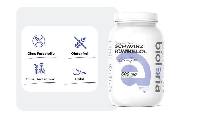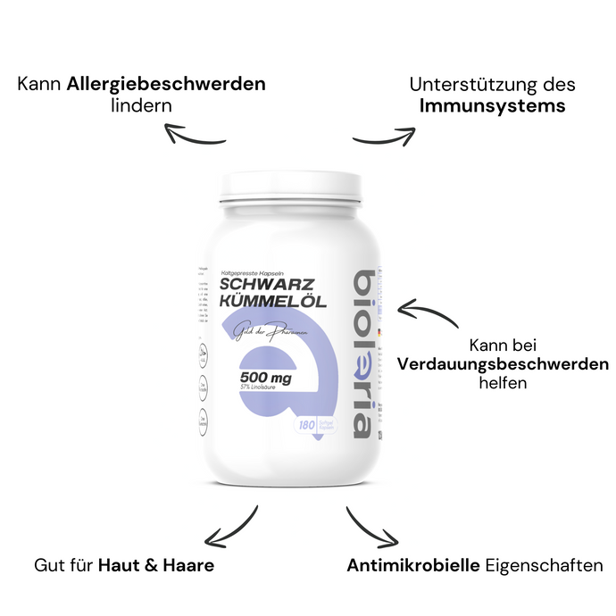- Unterstützung des Immunsystems: Schwarzkümmelöl enthält Thymochinon, eine Verbindung, die für ihre immunstärkenden Eigenschaften bekannt ist. Es kann die Produktion von Immunzellen fördern und die Abwehrkräfte des Körpers stärken.