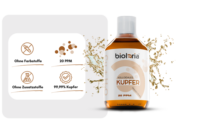 Bioleria® Kolloidales Kupfer entsteht durch die Verwendung von hochreinem medizinischem Kupfer (Cu 99,99%) und reinem Aqua bidest Reinstwasser im Elektrolyseverfahren. Nach der Herstellung beträgt die Kupferkonzentration 20 ppm, und das Produkt ist frei von jeglichen Zusatzstoffen.